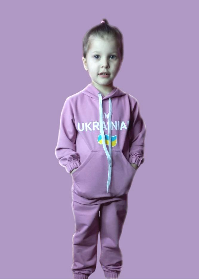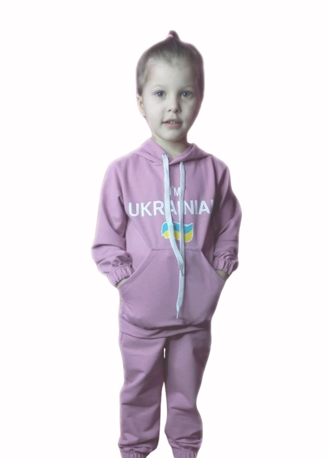Спортивний костюм “I’m Ukrainian” з капюшоном та шнурком для дівчат рожевого кольору, віком від 1 до 8 років та зростом від 80 до 122см з тканини турецька двонитка. Костюм з кишенями на штанях та кофтині, з принтом. Дуже м’яка на дотик та ніжна до тіла, стійка до багаторазового прання. Зручний костюм для повсякденного носіння, занняттям спортом, прогулянок. Рекомендована температура прання не більш ніж 40°.
