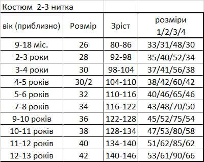 Розшифровка розмірів: 1 число-довжина кофти (см)/2 число-плече+рукав (см)/3 число-довжина штанців/4 число-довжина штанців по внутрішньому шву.